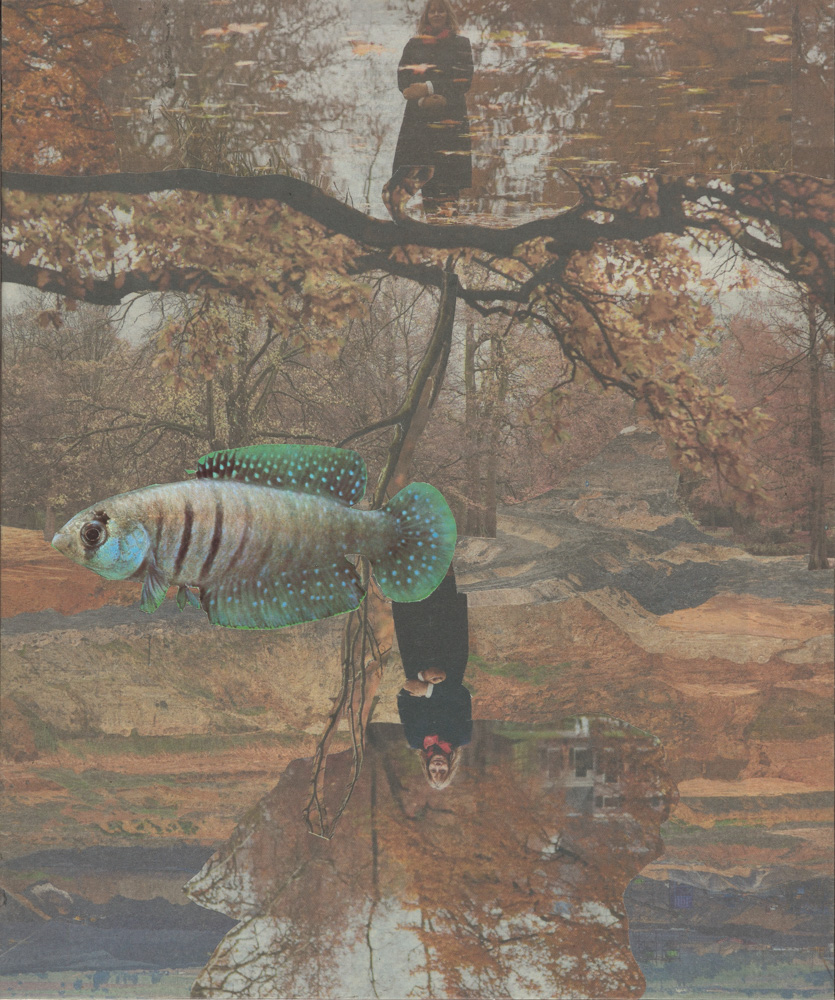 VISSEN KIJKEN – 21T5 – collage, krantenpapier op karton – 30×25 (foto Jan Torfs)